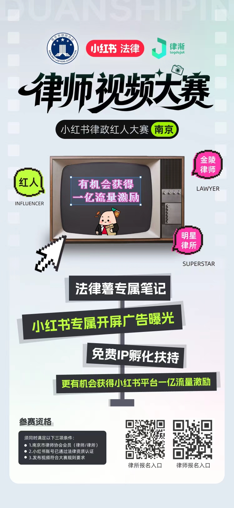 报名方式:请有意向参赛的律师事务所和律师扫描赛事报名二维码,填写参赛信息,按指引完成海选报名。参赛主体须提前完成小红书账号注册及律师职业认证。