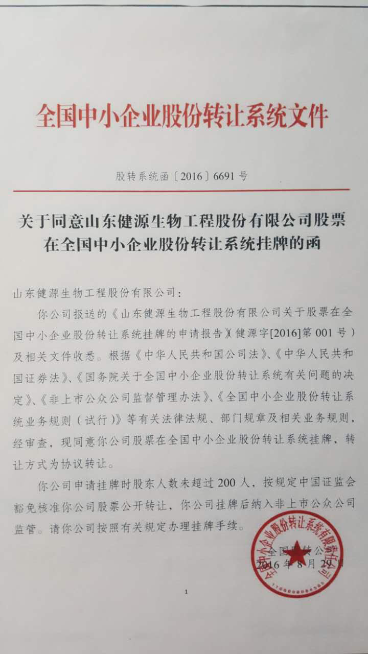 2016年8月29日,山东健源生物工程股份有限公司取得全国中小企业股份转让系统“新三板”同意挂牌函,证券代码839225,成功登陆新三板。
